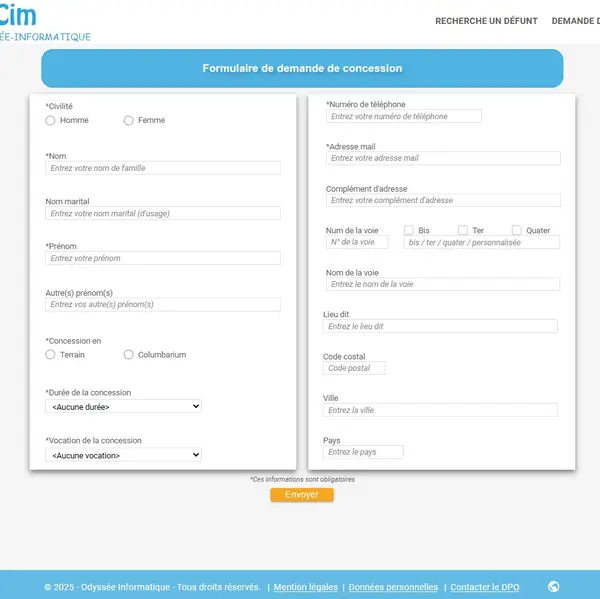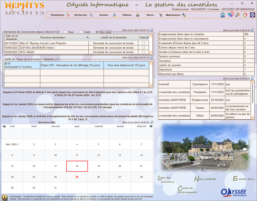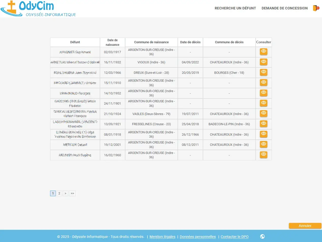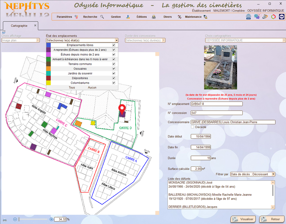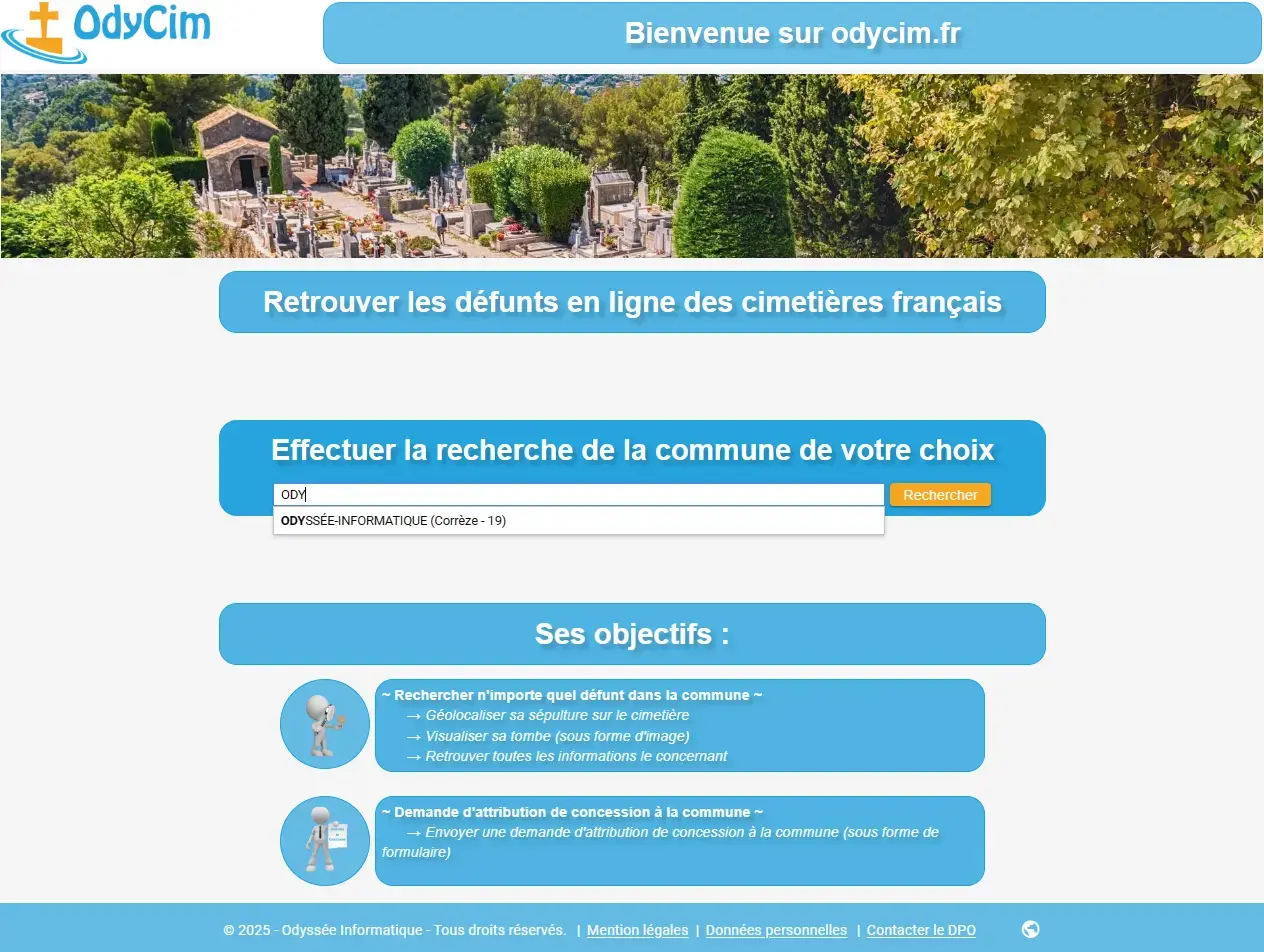 - Gestion des cimetières, carrés, allées, emplacements, concessions, contacts, défunts, travaux, prestataires, tarifs, et agendas.